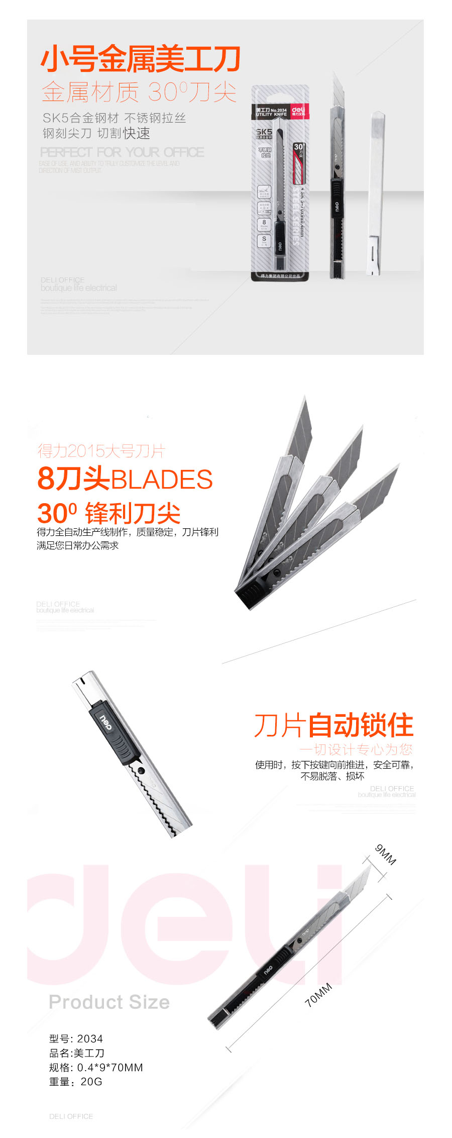 品名:得力(deli) 美工刀 2034 30度角 银色