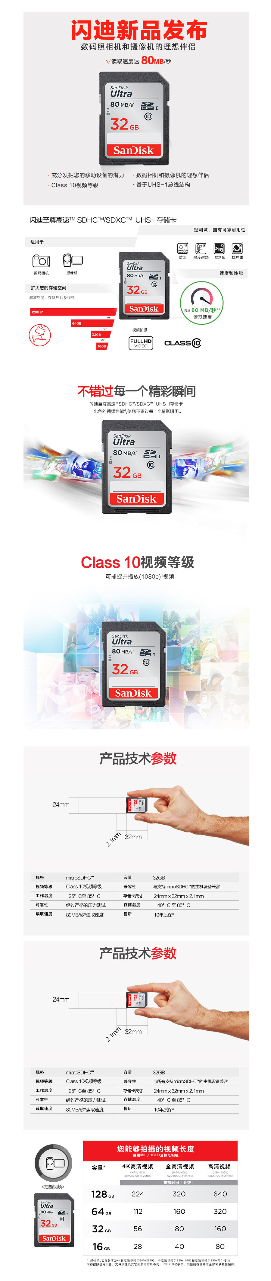 品名:闪迪(SanDisk) SD卡 SDHC UHS-I 32GB Class10 读速80MB/s