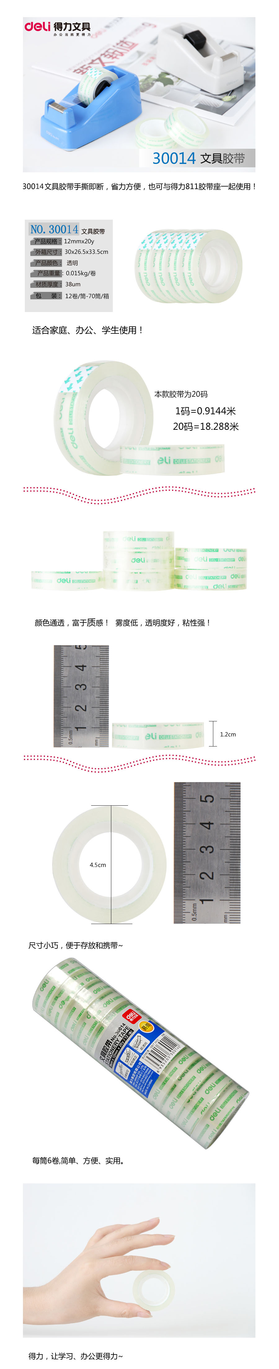 品名:得力(deli) 透明胶带 30014 1.2cm×20y 12卷/筒