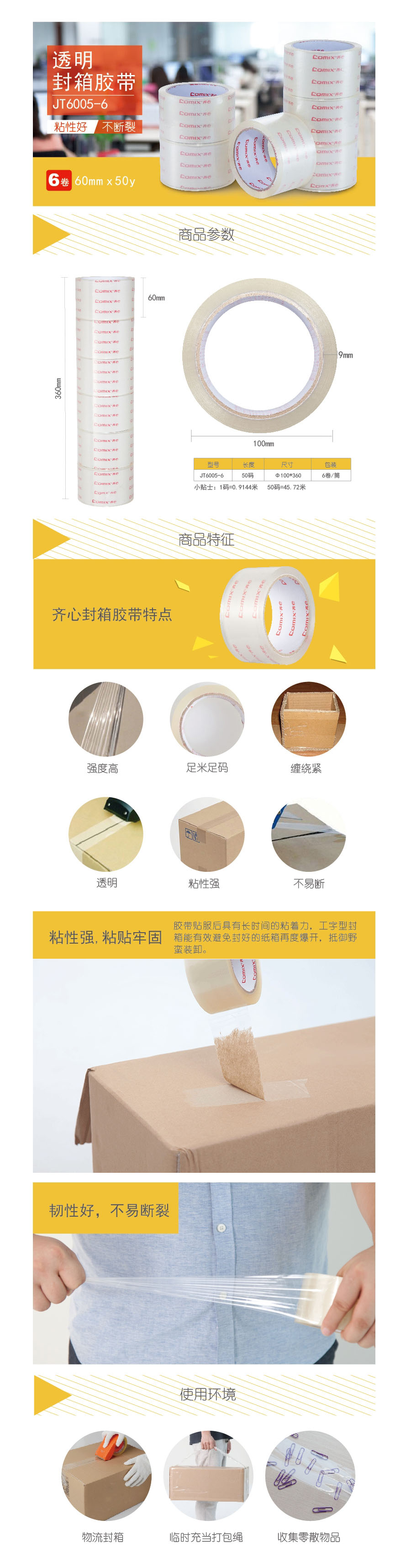 品名:齐心(COMIX) 封箱胶 JT6005-6 60mm×50y 6卷/筒