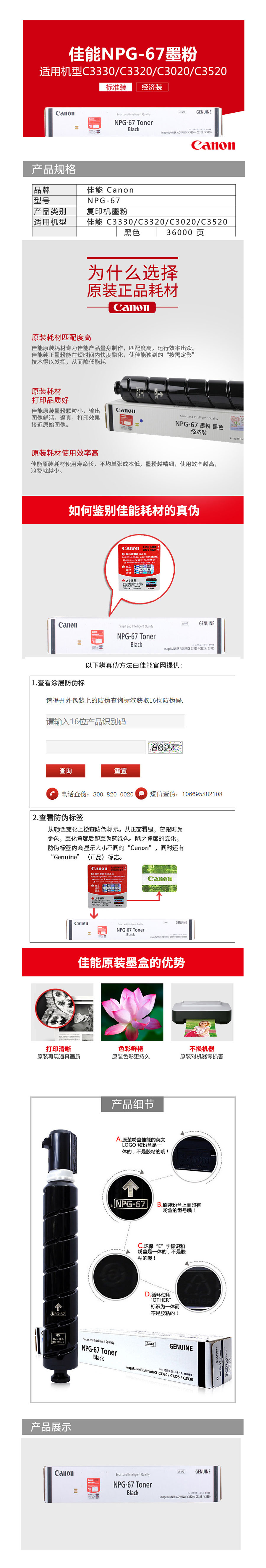 品名:佳能(Canon) 墨粉 NPG-67 黑色 大容量790g (适用于C3330、C3325、C3320、C3320L)