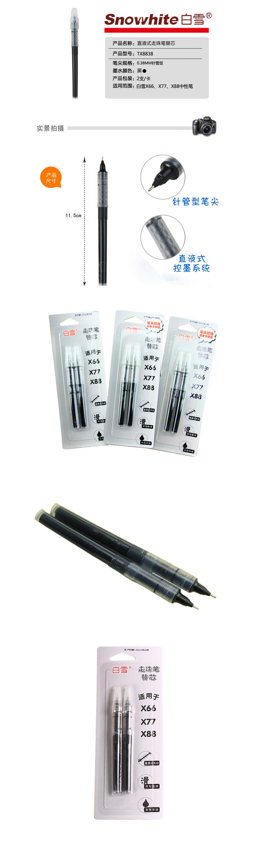 品名:白雪 走珠笔替芯 TX8838 0.38mm 针管型 黑色 两支装