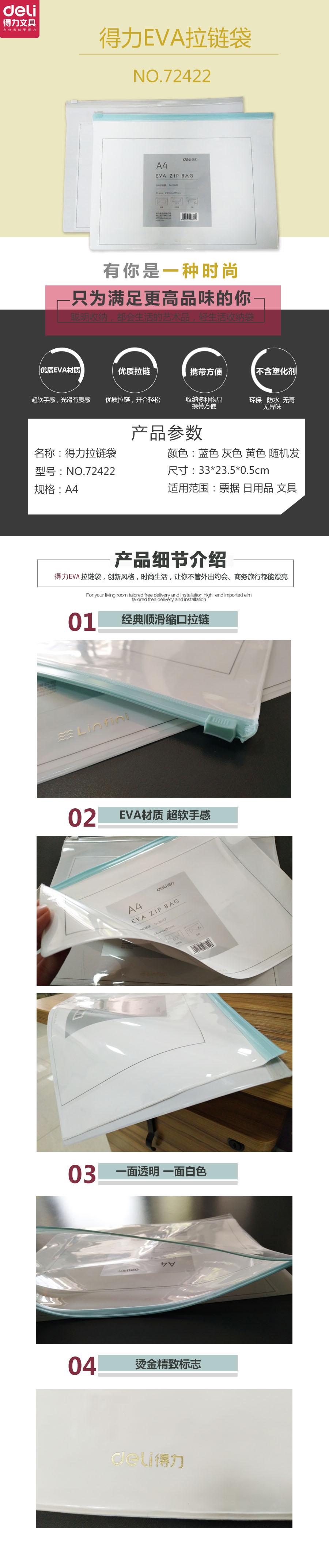 品名:得力(deli) 拉链袋 72422 A4 EVA拉链袋 33*23.5*0.5cm 颜色随机