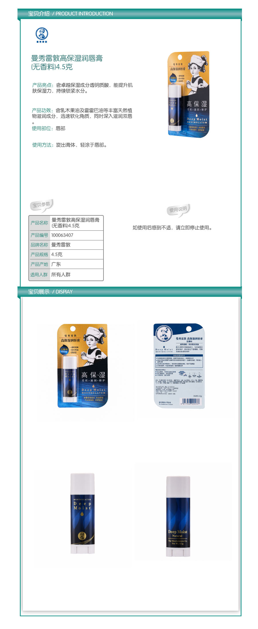 品名:曼秀雷敦(Mentholatum) 唇膏 高保湿润唇膏(无香料) 4.5g
