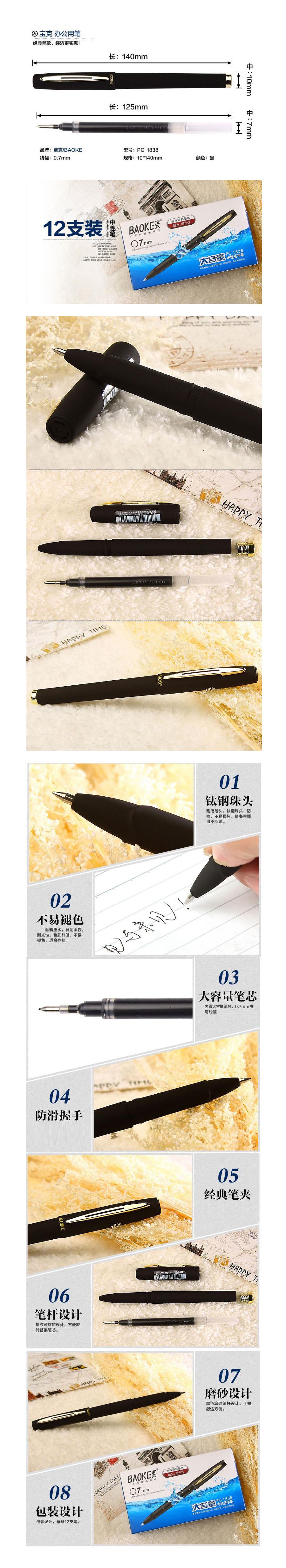 品名:宝克(BAOKE) 签字笔 PC1838 大容量中性签字笔 0.7mm 黑色磨砂笔杆 12支/盒
