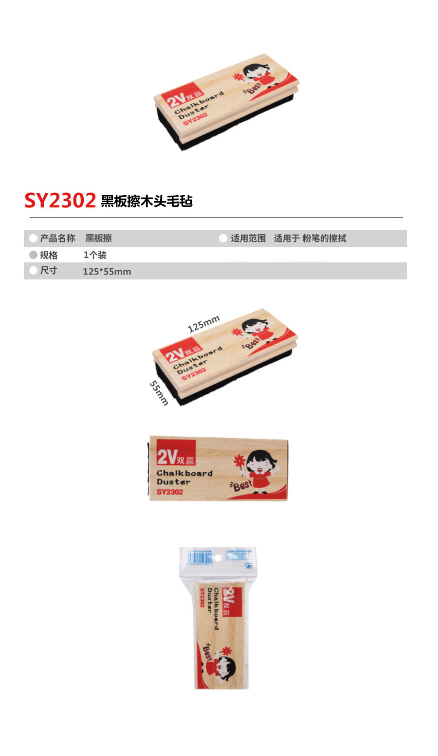 品名:双赢 黑板擦 2302 125*55mm 木头毛毡