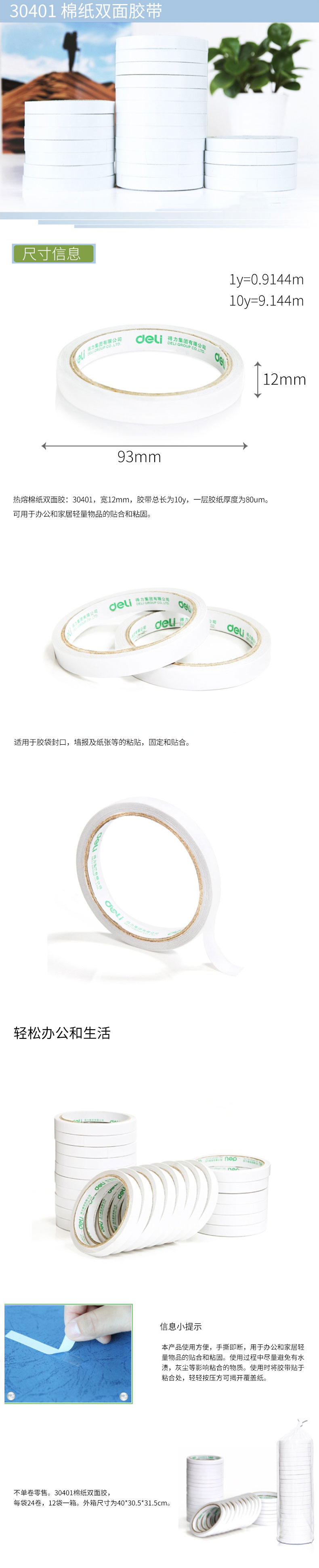 品名:得力(deli) 双面胶带 30401 12mm*10y 棉纸双面胶带 24卷/袋装