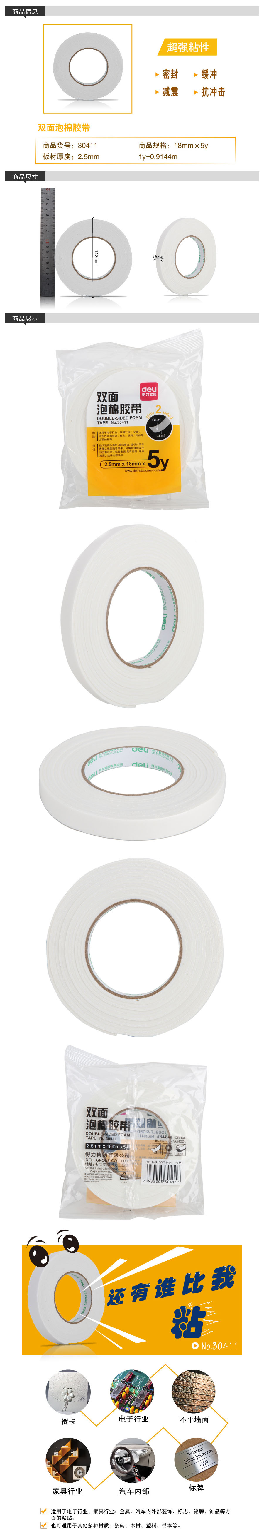 品名:得力(deli) 双面泡棉胶带 30411 2.5mm×18mm×5y
