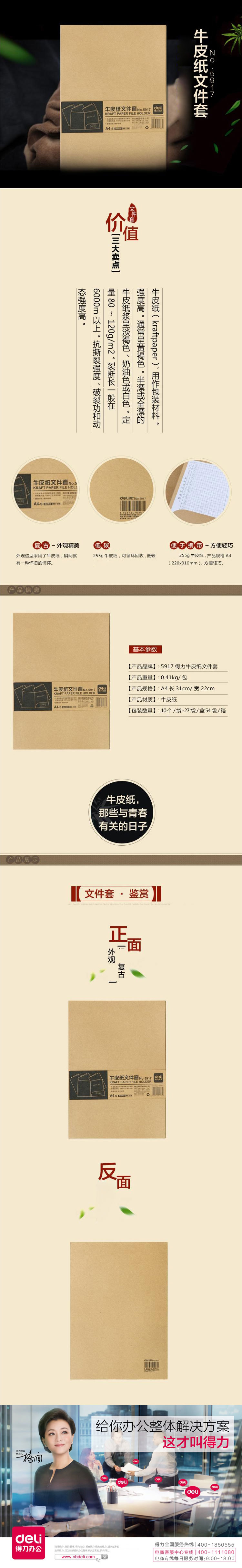 品名:得力(deli) 牛皮纸文件套 5917 10只/包 A4