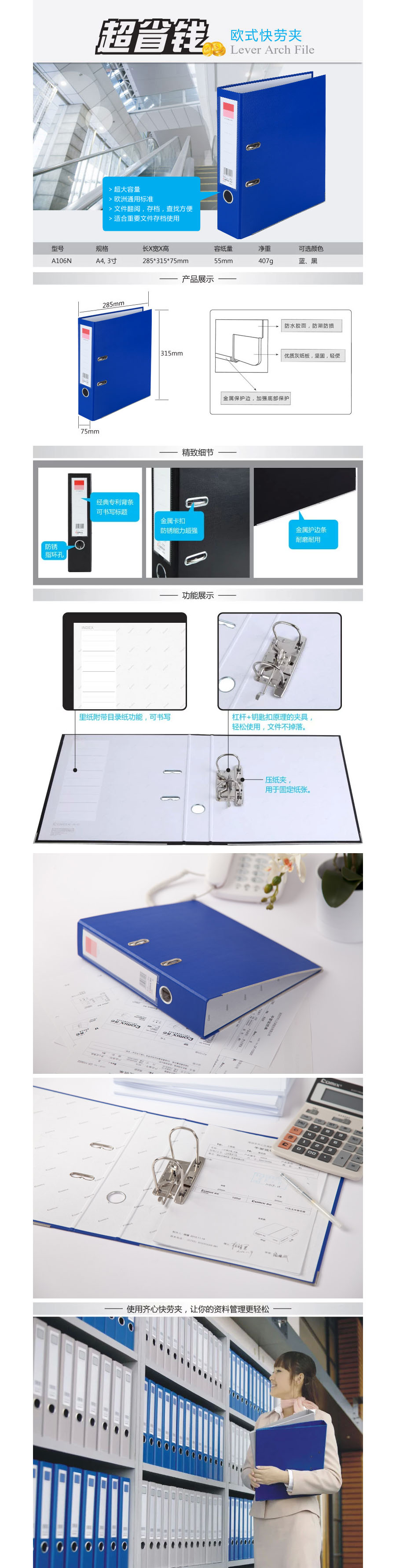 • 齐心 快劳夹 A4三寸文件夹档案夹打孔两孔活页资料夹3寸2孔 A106N 315x285x75mm 颜色随机